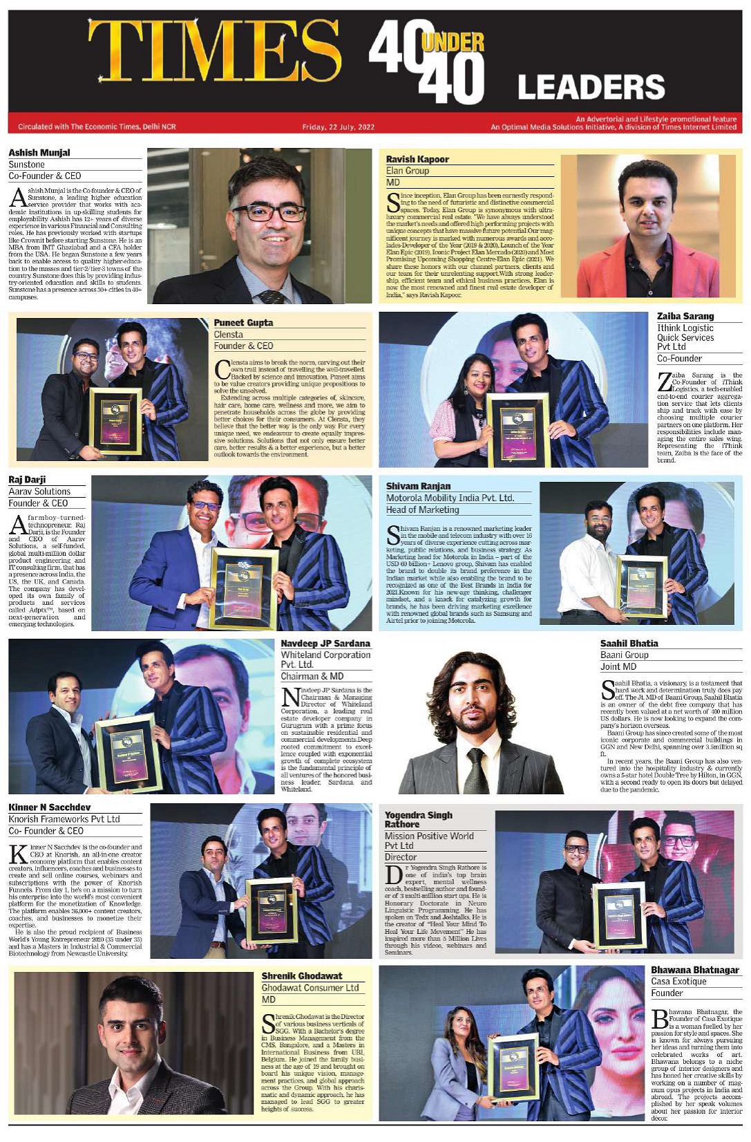 Times Group is one of India’s leading business publications and provides a platform called ’Times 40 Under 40′ to recognize the most influential leaders, entrepreneurs, and innovators under the age of 40. These business leaders are icons, inspirations, and game-changers in their respective fields who have been scaling new heights and transforming not just in India but making an impact globally.