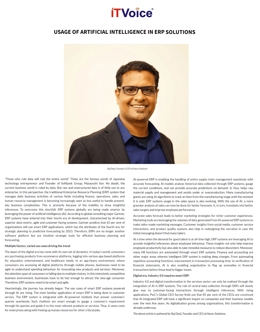 On the usage of AI in ERP solutions, some visionary thoughts were shared with IT Voice by the Founder and CEO of Aarav Solutions – Raj Darji.